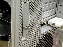 再看看背面,整个箱体高51.4厘米,宽46.73厘米,首先Mac G5不仅前面使用而且后面一并使用散热孔结构面板,显出极为夸张的样子;其次,Power Mac G5也没有采用Power Mac G4那样的六角星型的散热孔而是使用了正圆形的散热孔。后面板上布满了电源和USB火线设备等众多设备连接口,可以使你很轻松的就能将打印机、扫描仪、以及其它周边设备与 Power Mac G5 连接起来。