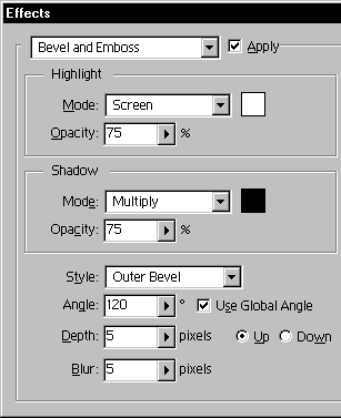 Inner Bevel Highlight Mode: Screen Highlight Opacity: 75 Shadow Mode: Multiply Shadow Opacity: 100 Style: Inner Bevel Angle: 120 Depth: 20 Blur: 2 Up/Down: Up |