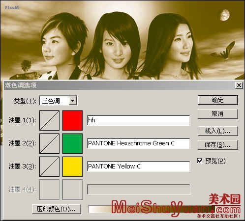 只能在灰度的情况下选择,该模式分四个类型,即单色调,双色调,三色调与四色调,在每个色调里调整颜色,画面整体颜色会变为油墨的混合色。
