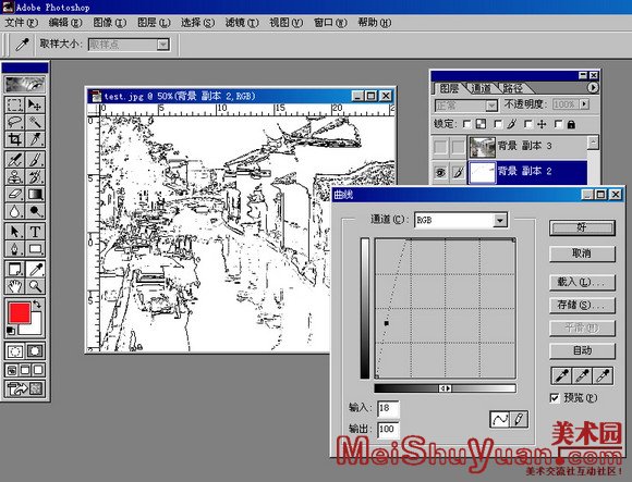 内容为:参数如图: 9、使用滤镜--风格化--查找边缘。 10、使用曲线去处画面中的灰色部分。 参数如图: 11、对图层2加一点高斯模糊。 参数如图: 12、将合成模式改为正片叠底。 13、将图层3变为黑白色。 14、提升对比度。 [