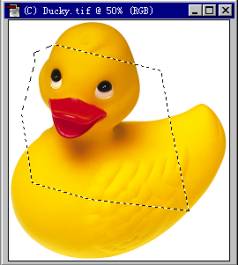 ,可以在图像中选取出不规则的多边图形。将鼠标移到图像点处单击,然后再单击每一罗甸,来确定每一条直线。当回到起点时,光标下就会出现一个小圆圈,表示选择区域已封闭,再单击鼠标即完成此操作(如图3-13所示)。Delete键和Alt键的操作和套索一样。多边套索的任务栏(如图3-14所示)也一样,这里就不再介绍了。