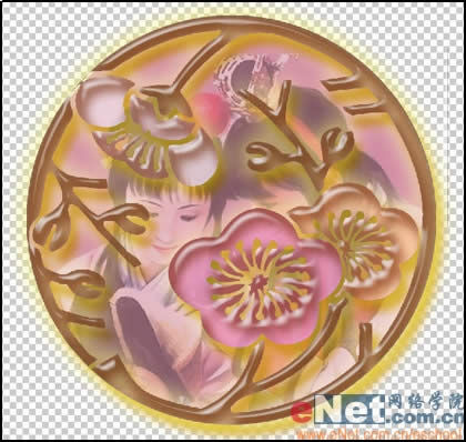 13、在“图层”控制面板下方单击“创建新图层”按钮,生成新的图层“图层3”,在工具箱的下方将前景色设为粉红色,其RGB的值分别为213、139、164。选择工具箱中的“椭圆选框”工具,按住键盘上的“Shift”键的同时,在图像窗口中绘制一个正圆形选区,用前景色填充选区,取消选区。将“图层3”拖拽到“图层1”的下方,效果如图14所示。