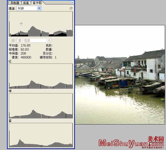 再看直方图,黑白场都有像素存在,图片不再显得那么灰