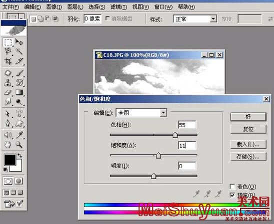 再运用“色相/饱和度”调节值为(55,11,0)单击“确定”。