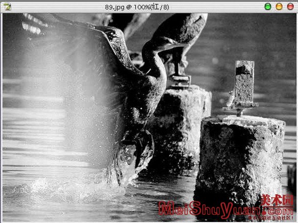 5)激活通道混合器右边的蒙板,然后点B键,切换到画笔工具,设置前景色为白色,背景色为黑色,在剩余有暴光部分的地方进行涂抹,如果涂过了也不要紧,用X键切换前景色与背景色,然后再进行涂抹恢复。最后再进行一下高斯模糊蒙板5个像素左右,让蒙板里的黑色与白色的过渡更自然。结果如图: