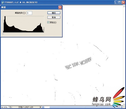 快速检查此类文件中色调高光和阴影剪贴情况的另一种方法是用“阈值”命令。这可快速确定是否值得对该文件进行大量的色调还原。实际上“阈值”命令的设计目的是实现一个色调级别的编辑并在图像预览中显示所选的级别。只需使用它并检查级别1(黑色)和级别255(白色),然后查看文件中丢失了多少色调信息。要进行这种评估,选择“图像”_“调整”_“阈值”。图7-44中显示了图像和“阈值”对话框。