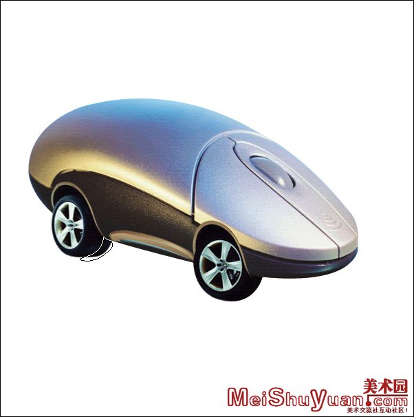 11.好了,大致鼠车的合成就这样,具体细节之处,大家可以把轮胎的层复制一个,置于鼠标层的下面,并适当调整位置后,做出鼠车的另一侧的轮胎,别的大家就可以自由发挥,作一下自己喜爱的处理,(图14)。