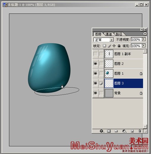 24、焦散制作。作为一个玻璃瓶子,自然会有折射,折射会直接投射到阴影里面,在隐隐里面产生亮光。我们选择玻璃瓶的亮色,然后画出一个椭圆形,并用该色填充。