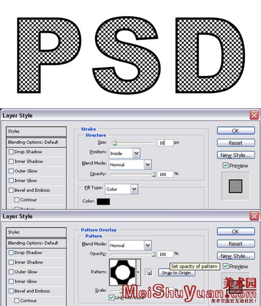 现在我们将应用两种图层样式。首先应用描边(Stroke)样式,设置如下:尺寸10像素,位置为内部,混合模式为正常。不透明度为100%,颜色为黑色。然后应用图案叠加样式(Pattern Overlay),设置如下:混合模式为正常,不透明度100%,样式设置为“孔”,比例设置为50%。
