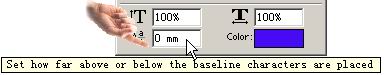 这个面板中的部分选项可以在Type选项栏中找到。其中,图19中所示的下拉菜单用于设置多行文本中各行的距离,图20所示的下拉菜单用于设置字符间距下拉菜单。在图21中手势所指处的文本编辑框中还可以设置字符在垂直方向上的比例值,位于它右旁的文本编辑框则用于设置字符在水平方向上的比例值,图22中手势所指处的文本编辑框则用于设置文本字符与基线的距离。