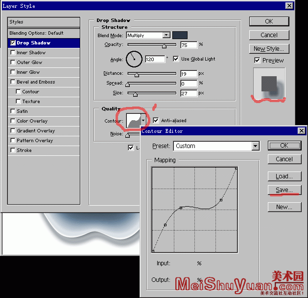添加图层效果----投影。点击图中红圈标识的曲线可调整其外形并能保存下来。