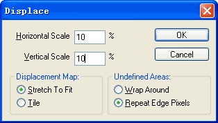 回到MM文件窗口中,在Layers面板上选择BMW图层,然后选择菜单命令Filter→Distort→Displace,在对话框中,水平和垂直变化程度均保持为10%,下面两个选项保持默认(如图11)。