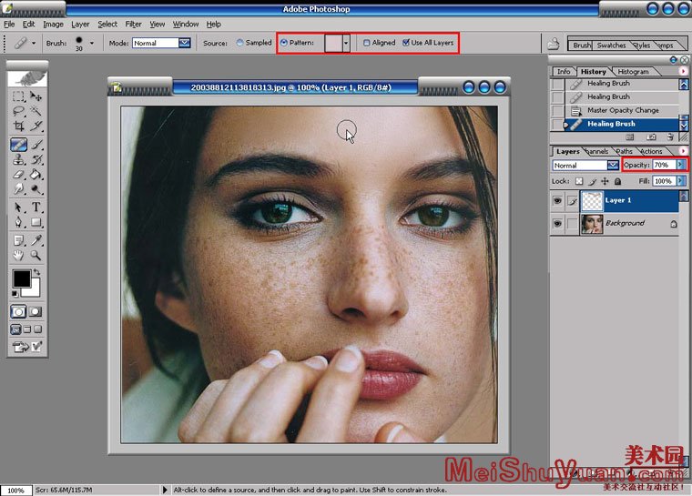 我们惊奇地发现,带有图案的修复画笔成了很神奇的修复工具,在去除斑点的同时保持了一定的皮肤纹理。因为修复画笔不能设置笔刷不透明度,所以我把图层1的不透明度降为70%,让修复效果更加自然。