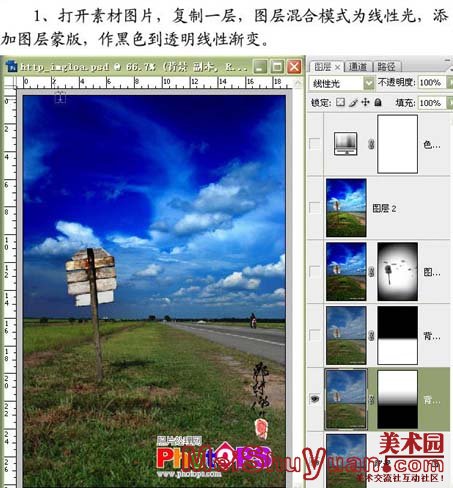 1、打开下面的背景素材,复制一层,图层混合模式改为“线性光”,加上图层蒙版,做黑色到透明的线性渐变。
