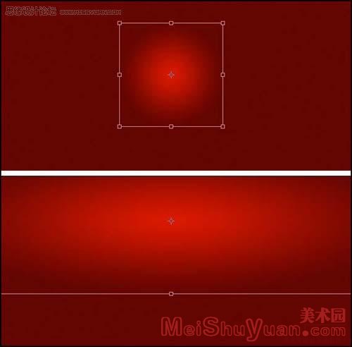 新建一图层,选择渐变工具-径向渐变,调整颜色为红色(218,0,0)到透明色的渐变,快捷键ctrl+t选取,横向拖动达到下面效果: