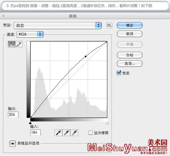 | 3、接着我们在ps里面找到菜单:图像 > 调整 > 曲线,调整参数及效果如下图。 |