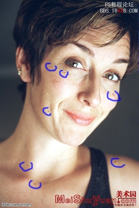 第3步 创建一个新的空白层略高于图层 1。选择修复刷( J ),并确认是选中“对所有图层取样”。对大的雀斑或污点,仿制去除。 (一个好的经验是永远不会以任何方式修改您的源图像。为什么使用一个新的层。就是让你永远知道原图是什么样子的) 要去除的地方 第4步 在所有的图层最上面最新层!按ctrl+shift+ale+E 盖印所有图层效果! 勾出皮肤部份,这时你可以选择适合自己的方法,我个人比较喜欢钢笔工具,当然你也可以使用多边形套索工具,要注意的是,我们要处理的是皮肤,所以要去除眼睛,眉毛,嘴唇,鼻孔。 然后反选(ctrl+shift+i )删除除皮肤,多余部份。 进入滤镜“模糊”高斯模糊。设置半径为20。设置层的透明度为75 % 。 按CTRL+J 复制图层3 ,。在新层中进入“滤镜”--“其他”--“高反差保留”。数值参考下图 设置混合模式为“线性光”,并设置不透明度为40 % 。 做完! 效果图